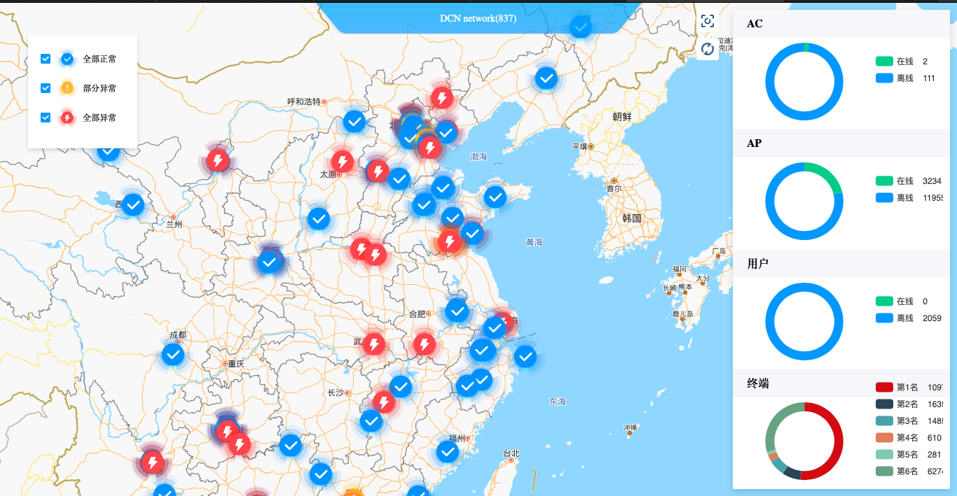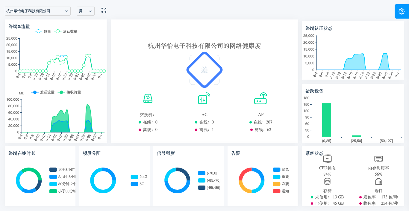 网络状态在系统中通过各种图表,让管理者一目了然了解和维护整张网络,页面的网络配置、组织机构配置、使用状态统计、故障诊断及告警等各种功能组件轻松管理和维护无线网络。