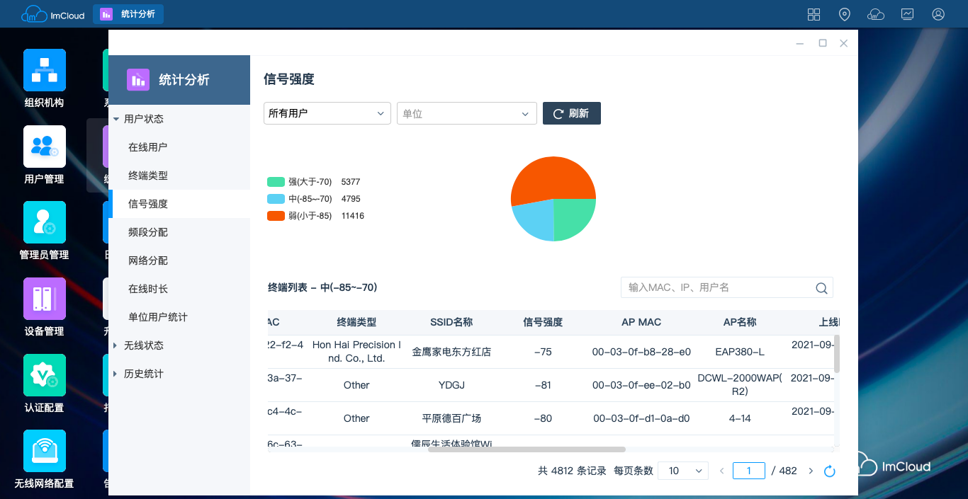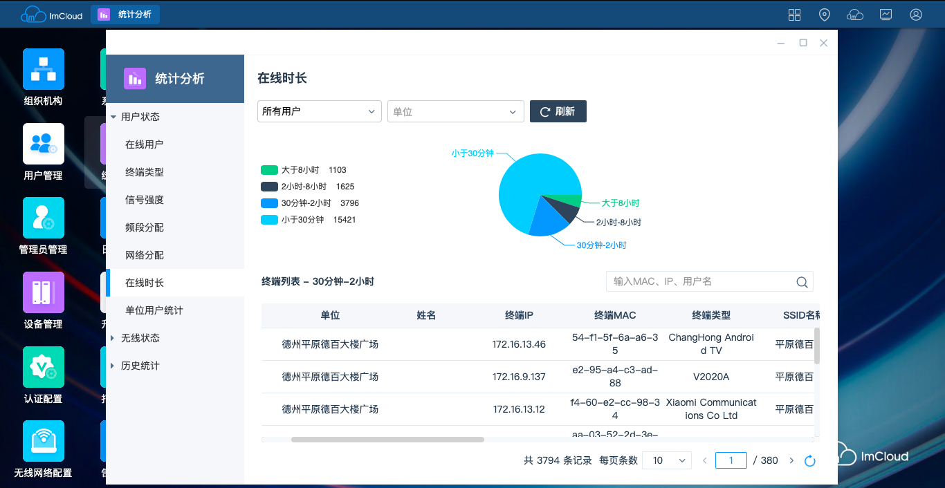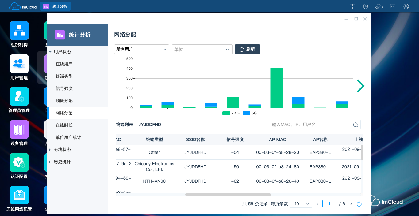 —用户终端统计:终端类型、终端信号强度、频段分配、网络分配、在线时长、单位统计等