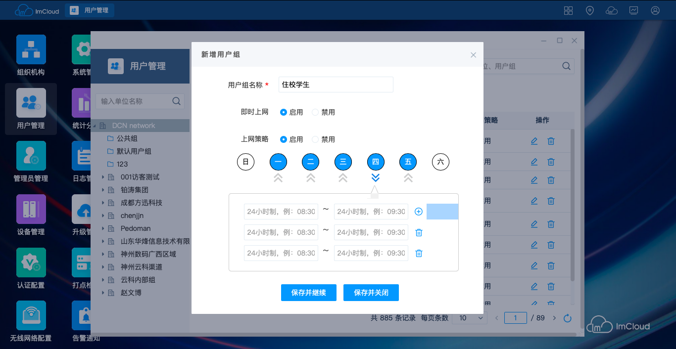 针对不同组织机构可以建议不同的用户组,对每个用户组设置基于周、日、时、分的上网策略,来精确控制无线网络用户的上网时段。
