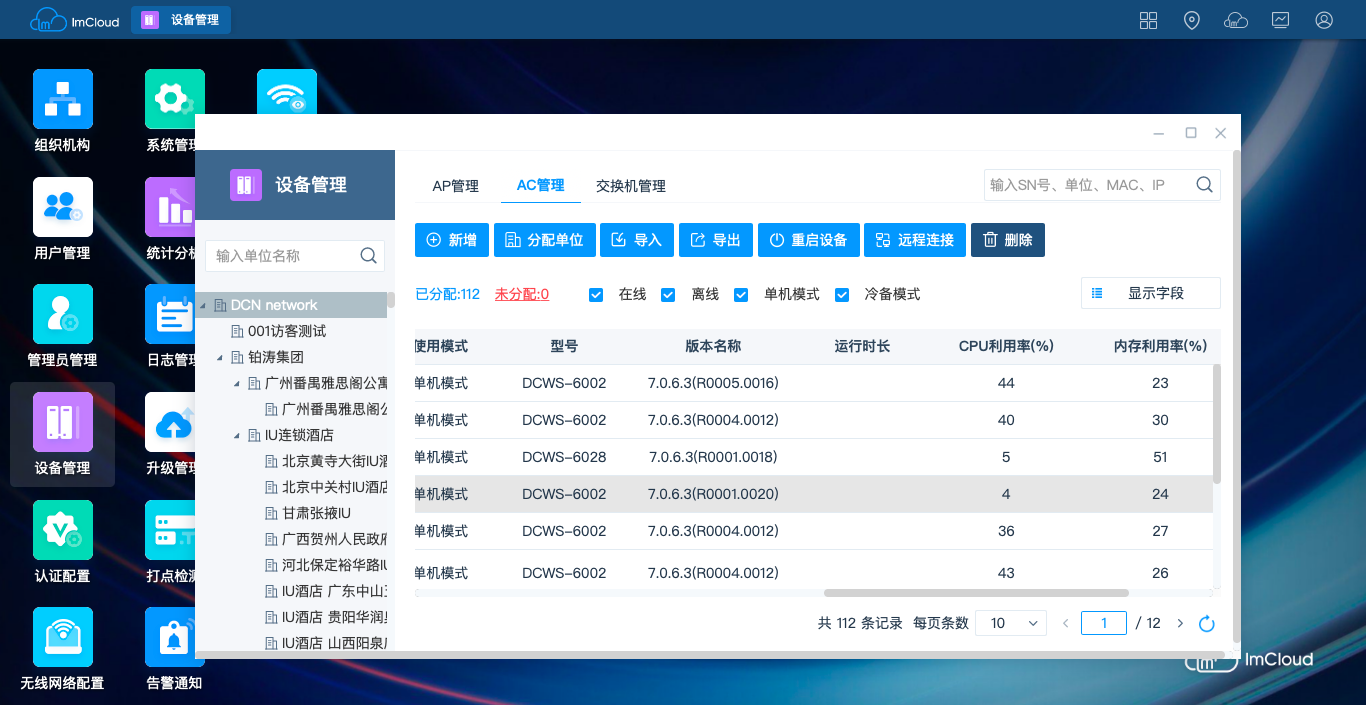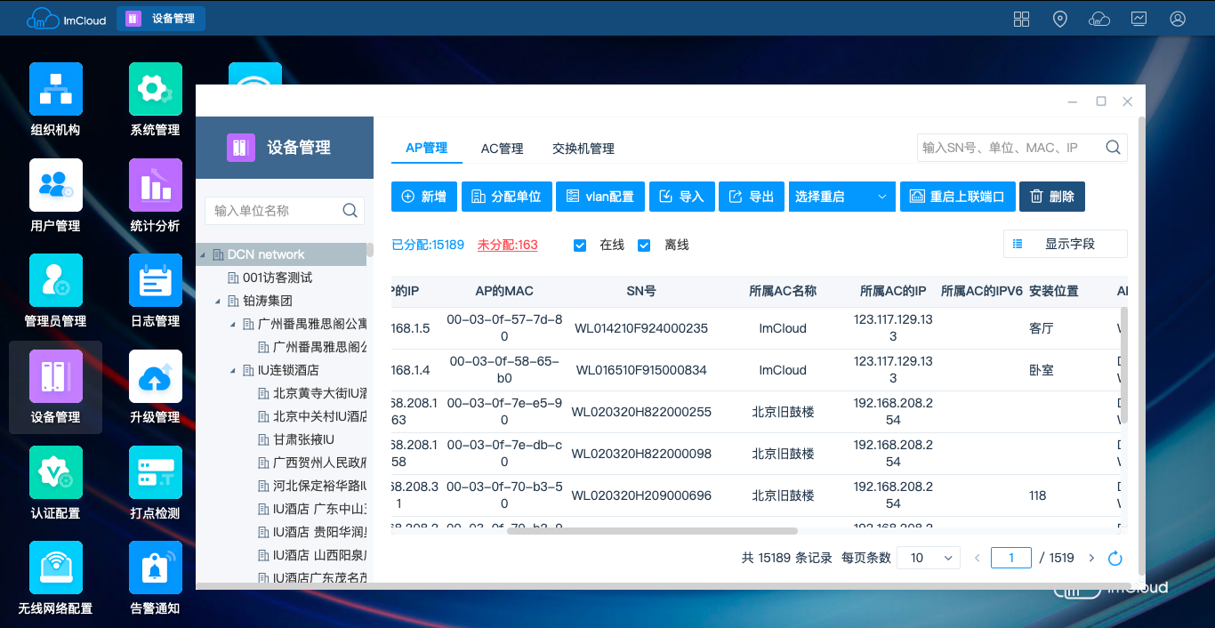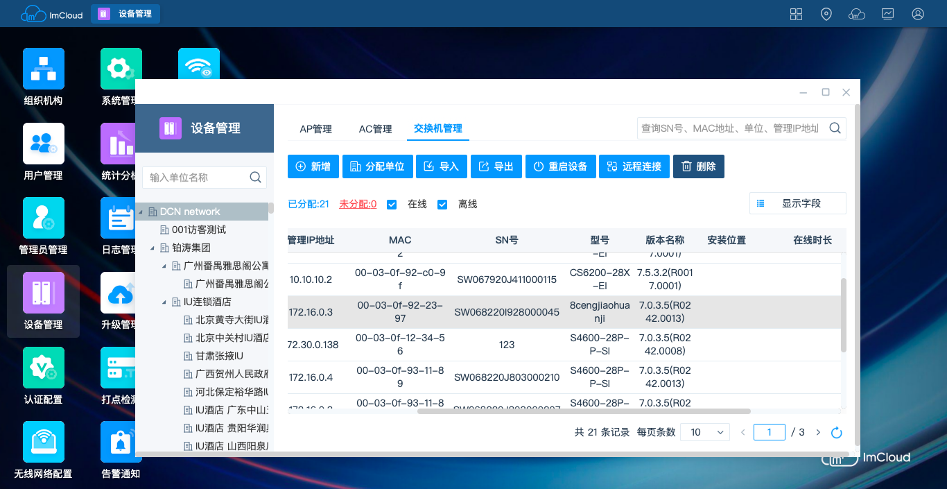 数据网络作为承载应用业务和数据的通道,随着网络节点逐渐增加,网络规模越来越大。在企业网、连锁商超、连锁酒店酒店和普教等场景,无线网络的部署可能需要几千台AP,这样的网络需要专业IT人员管理才能保障通道畅通,运维成本不断攀升。DCN云管理ImCloud方案是网络服务的新模式,基于云端实现网络服务和管理,将复杂的网络管理简单化、智能化、可视化,提升用户网络体验。实现“不懂IT也可以熟练管理、使用网络”。